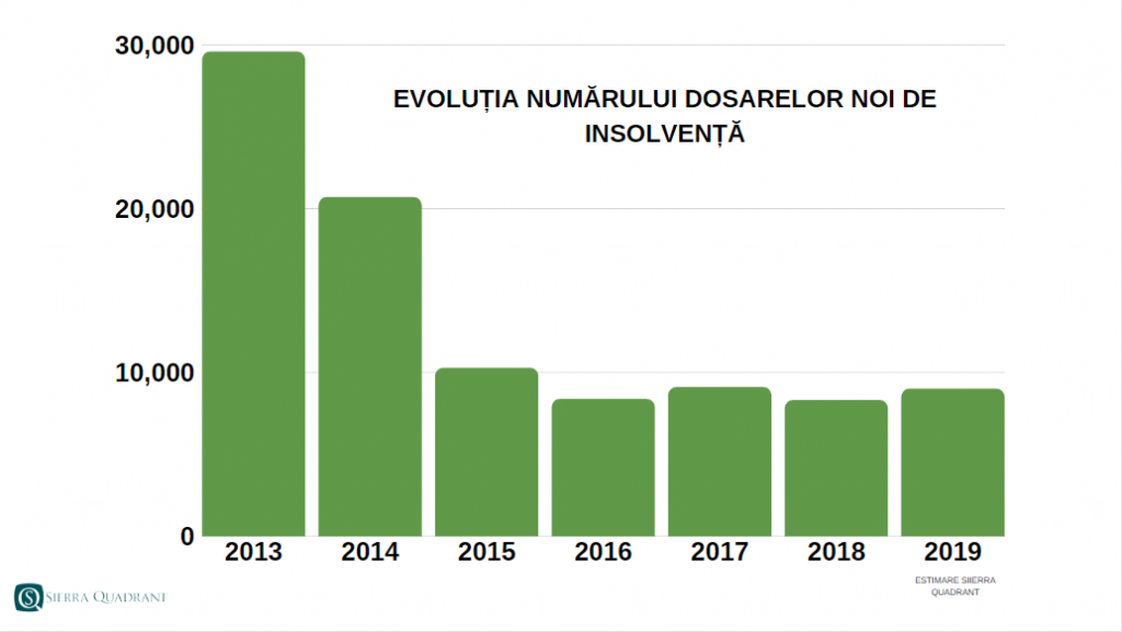 Sierra Quadrant estimează că, pe fondul accentuării blocajului financiar și tendinței de dezintermediere și conservare a business-urilor, numărul insolvențelor din 2019 ar putea trece de 9000 de cazuri.