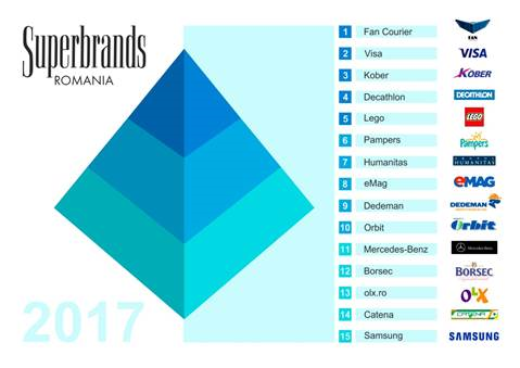 Top 15 branduri desemnate Superbrands în România pentru anul 2017 include: Fan Courier; Visa; Kober; Decathlon; Lego; Pampers; Humanitas; eMAG; Dedeman; Orbit; Mercedes-Benz; Borsec; olx.ro; Catena; Samsung.
