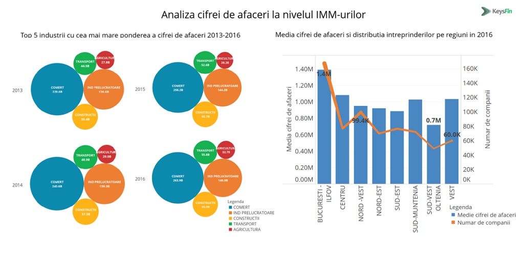 Potrivit datelor KeysFin, în România erau înregistrate, la finalul anului 2016, 671.040 de IMM-uri, cu peste 50.000 mai multe decât în anul precedent. Afacerile acestora au crescut semnificativ în ultimii ani, de la 621,1 miliarde lei în 2013 la 713,3 miliarde lei în 2016.