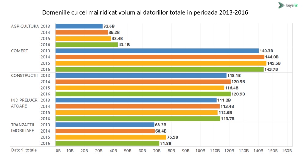 Potrivit datelor KeysFin, IMM-urile din acest sector raportau la nivelul anului trecut datorii de 143 miliarde de lei (21% din totalul datoriilor IMM-urilor), urmate de cele care activează în construcţii (120,9 miliarde lei), industria prelucrătoare (113,7 miliarde lei), tranzacţiile imobiliare (71,8 miliarde lei) şi Agricultură (43,1 miliarde lei).