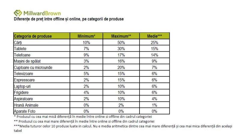 Studiul arată că prețurile acelorași produse sunt mai mici în medie în magazinele online decât în magazinele offline. Diferențele cele mai mari se regăsesc în rândul cărților (25%), tabletelor (15%) și al telefoanelor mobile (14% ) în timp ce diferențele cele mai mici sunt la aspiratoare (4%) și hrana pentru animalele de companie (1%).