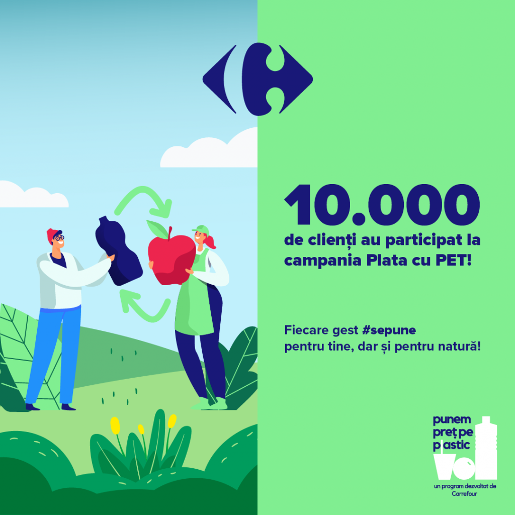 „Iată că, în mai puțin de două luni clienții noștri au ales să treacă la obiceiuri mai bune de consum, acasă și la cumpărături, alături de noi. Numărul mare de clienți participanți ne arată faptul că există interes pentru reciclare în rândul românilor, însă au nevoie de o infrastructură potrivită și mai ales încredere că efortul lor nu este în zadar și acțiunile de reciclare chiar au efect. În această perioadă, inițiativa Plata cu PET a arătat că fiecare comportament responsabil #sepune pentru fiecare dintre noi, dar în mod special pentru natură! Campania Plata cu PET nu se încheie aici, caravana este pe drum spre celelalte orașe planificate și ne bucurăm că anul acesta am reușit să fim prezenți în 19 orașe din țară!”, a declarat Felician Cardoș, Environmental Manager Carrefour România.