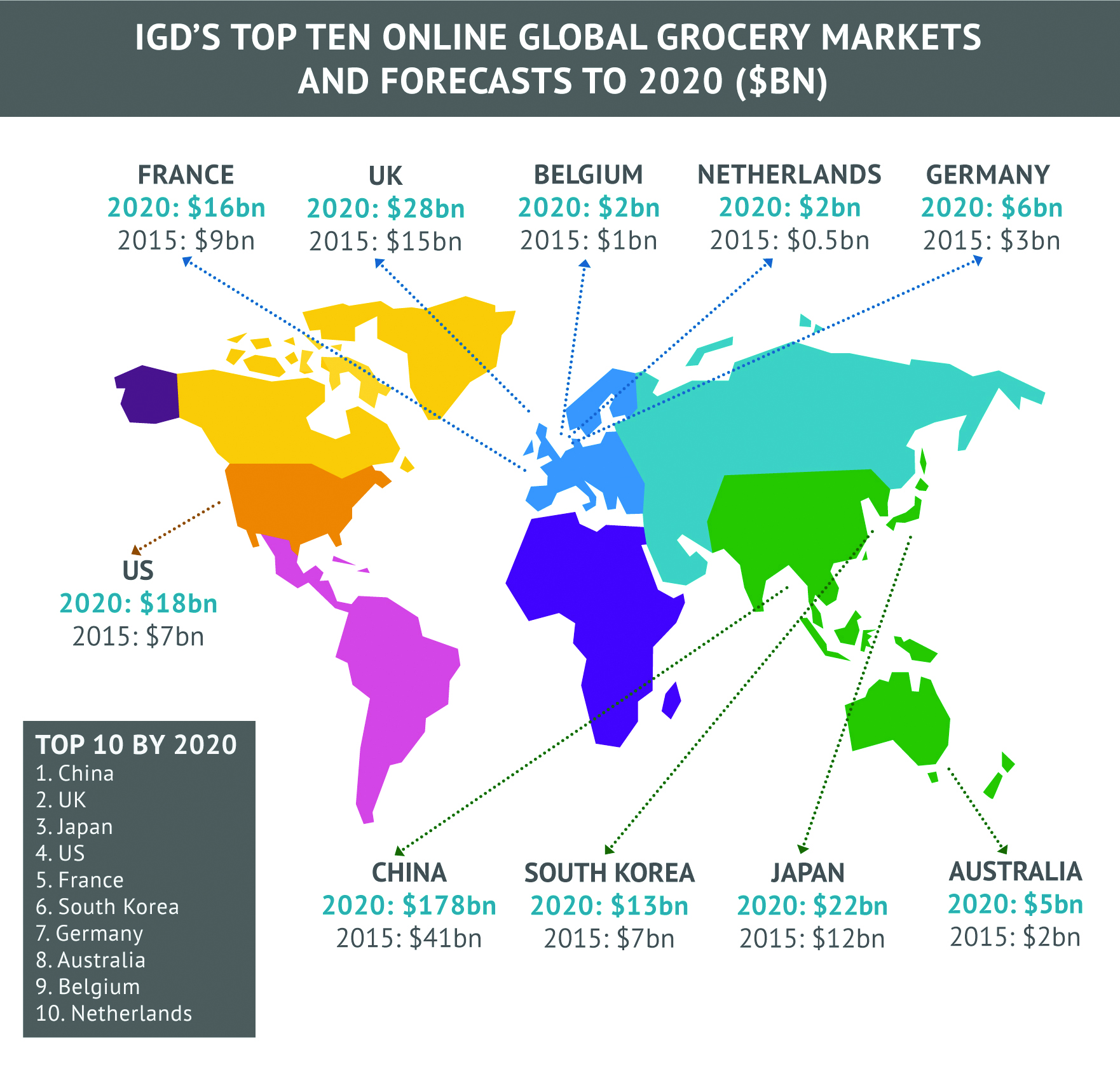 Comerţul online cu produse alimentare din China va ajunge la valoare de aproape 180 de miliarde de $, în 2020 – de aproape cinci ori valoarea actuală (41 de miliarde de $), conform raportului „Top 10 Online Grocery Markets”, întocmit de IGD. O creștere de două cifre a componentei online a comerţului cu produse alimentare se aşteaptă să continue şi în alte pieţe. Acest lucru face ca investițiile în acest canal să fie pe primul plan pentru companiile care doresc să satisfacă nevoile noului cumpărator care s-a adaptat rapid la ceea ce se numeşte multichannel.