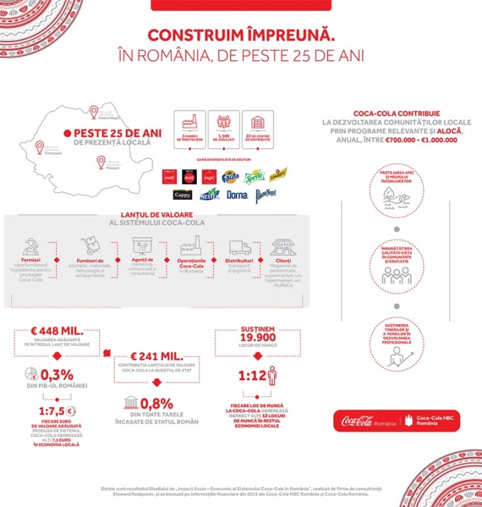 Peste jumătate din această sumă, generată de întregul lanţ de valoare Coca-Cola, reprezintă contribuţia la bugetul de stat – 241 milioane euro – şi constituie 0,8% din toate taxele încasate de statul român. Totodată, fiecare loc de muncă la Coca-Cola generează alte 12 locuri de muncă în economie.