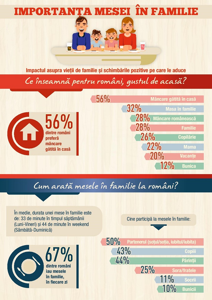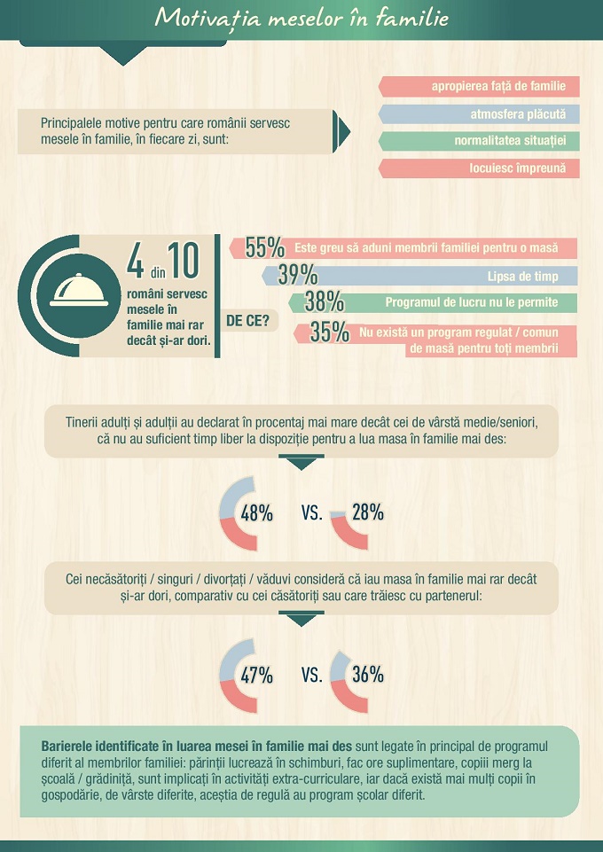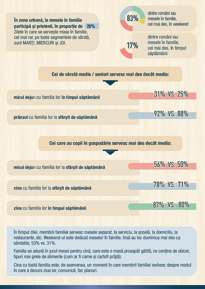 Programul încărcat al românilor își pune amprenta și pe tipul meselor în familie. Majoritatea românilor servesc cel mai des cina în familie, în timpul săptămânii (80%), iar în weekend, servesc prânzul în familie cu o preponderență mai mare (88%). În timpul zilei, membrii familiei servesc mesele separat, la serviciu, la școală, la domiciliu, la restaurante, fiind caracterizate de grabă, presiune temporală (oamenii trebuie să ajungă sau să revină la locul de muncă, la școală etc.).