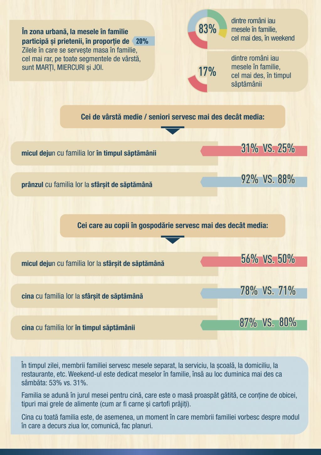 În continuare, conform aceluiași studiu desfășurat de brandul Delikat, weekend-ul rămâne rezervat meselor în familie, duminica fiind ziua preferată pentru acestea. Zilele în care se servește masa în familie cel mai rar, pe toate segmentele de vârstă, sunt marți, miercuri și joi. Pentru că se bucură de mai mult timp pentru pregătiri, românii se reunesc cu familiile la masă în weekend și servesc preparate gătite în casă, mai elaborate, de mai multe tipuri, inclusiv desert. În timpul zilei, membrii familiei servesc mesele separat, la serviciu, la școală, la domiciliu, la restaurante, etc, fiind caracterizate de grabă, de presiunea temporală (oamenii trebuie să ajungă / să revină la locul de muncă, la școală etc.).