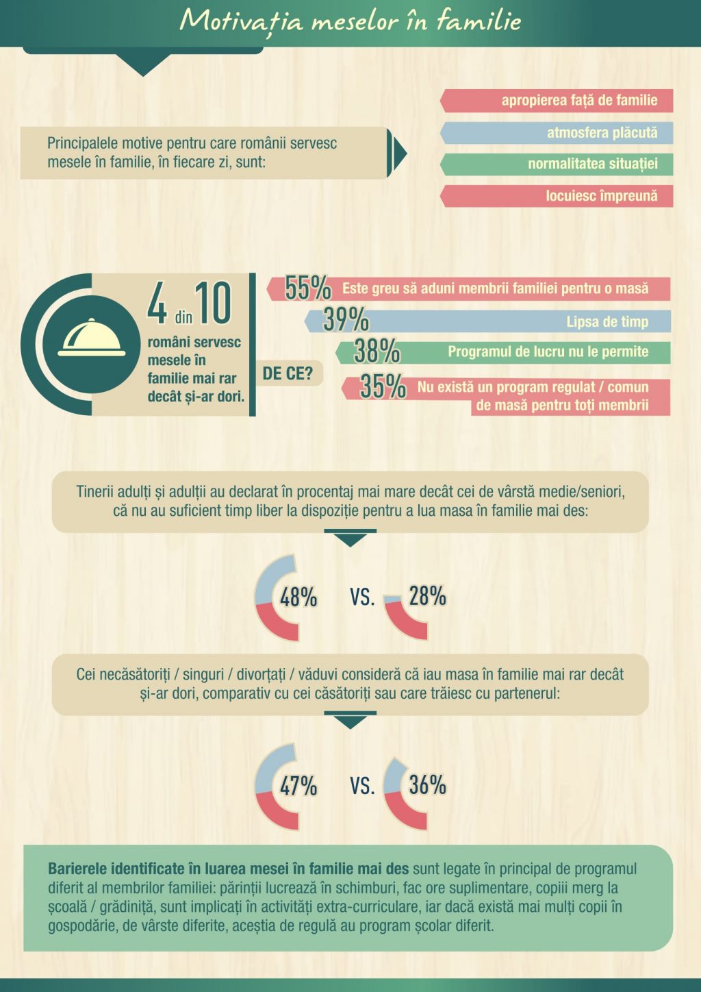 Principalele bariere pe care românii le întâmpină sunt legate de dificultatea de a reuni toți membrii familiei la masă în același timp (55%), lipsa timpului liber (39%), program de muncă prelungit sau inflexibil (38%), lipsa unui program comun cu familia (35%).