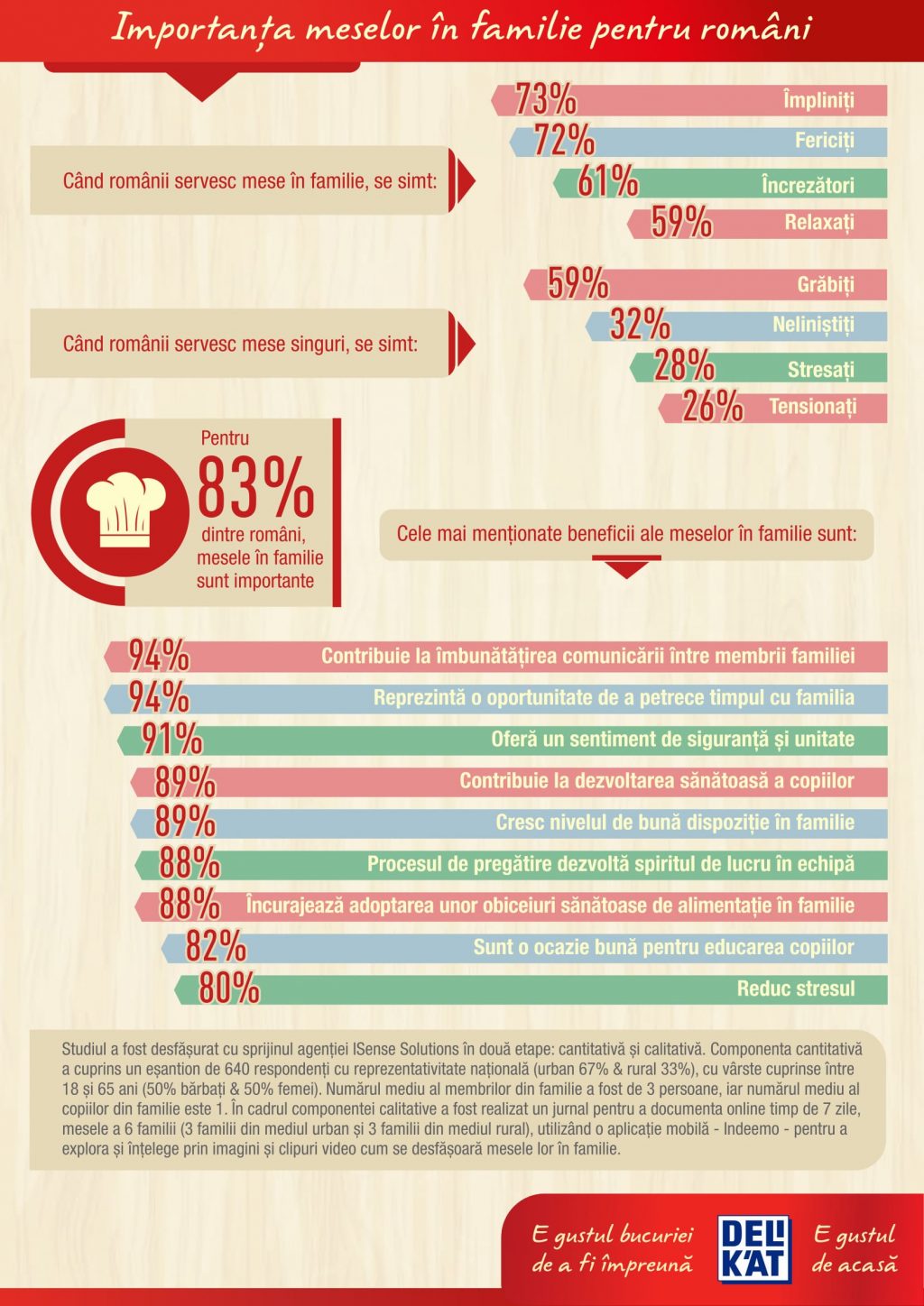 Studiul național „Mesele în familie la români” face parte din campania derulată de brandul Delikat, cu scopul de a crește gradul de conștientizare asupra importanței meselor în familie. Acesta constituie doar o primă etapă a campaniei, obiectivul fiind de a instaura Ziua Națională a Meselor în Familie, pentru a susține și promova în fiecare an, beneficiile meselor în familie, în toată țara. Studiul a fost desfășurat cu sprijinul agenției ISense Solutions în două etape: cantitativă și calitativă. Componenta cantitativă a cuprins un eșantion de 640 respondenți cu reprezentativitate națională (urban 67% & rural 33%), cu vârste cuprinse între 18 și 65 ani (50% bărbați & 50% femei). Numărul mediu al membrilor din familie a fost de 3 persoane, iar numărul mediu al copiilor din familie este 1.