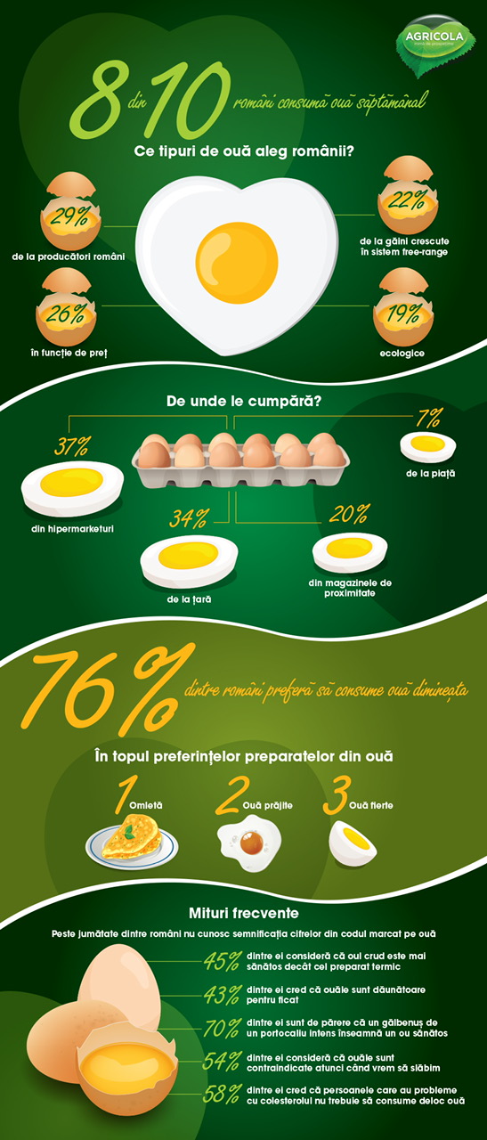 Doi din zece români caută la raft ouă ecologice și tot atâția caută ouă provenite de la găini crescute în sistem free-range (în aer liber, cea mai mare parte a timpului). Cu toate că au intrat recent pe piața autohtonă, ouăle îmbogățite natural cu diferiți nutrienți (Omega 3, luteină, antioxidanți) sunt produse care încep să câștige interesul publicului român, 3% dintre cei chestionați alegându-le pe acestea în detrimentul celor clasice.