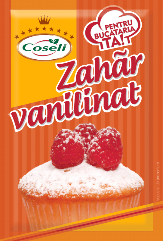 Zahărul vanilinat COSELI este un zahăr pudră cu aromă de vanilie, ce asigură o dispersie uniformă şi rapidă a aromei în produsul care trebuie aromatizat. Acest produs prezintă avantajul tradiţional şi estetic că poate fi utilizat la ornarea prin pudrare a produselor de patiserie, faţă de zahărul tos.