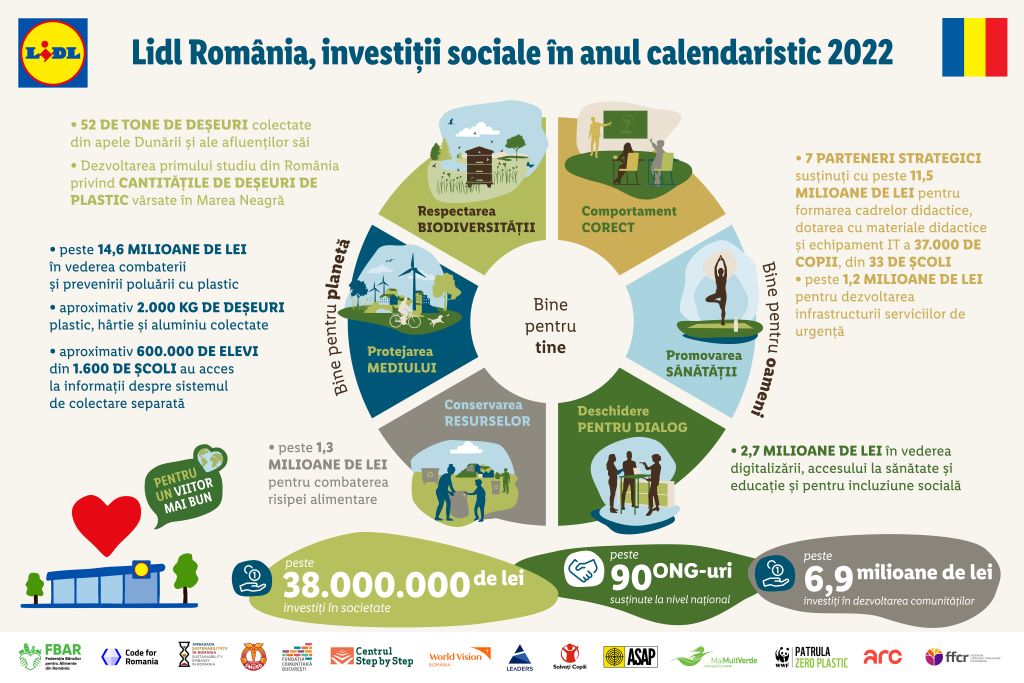În 2022, Lidl România a investit peste 38 milioane de lei în dezvoltarea comunităților locale, susținând peste 90 de ONG-uri, la nivel național