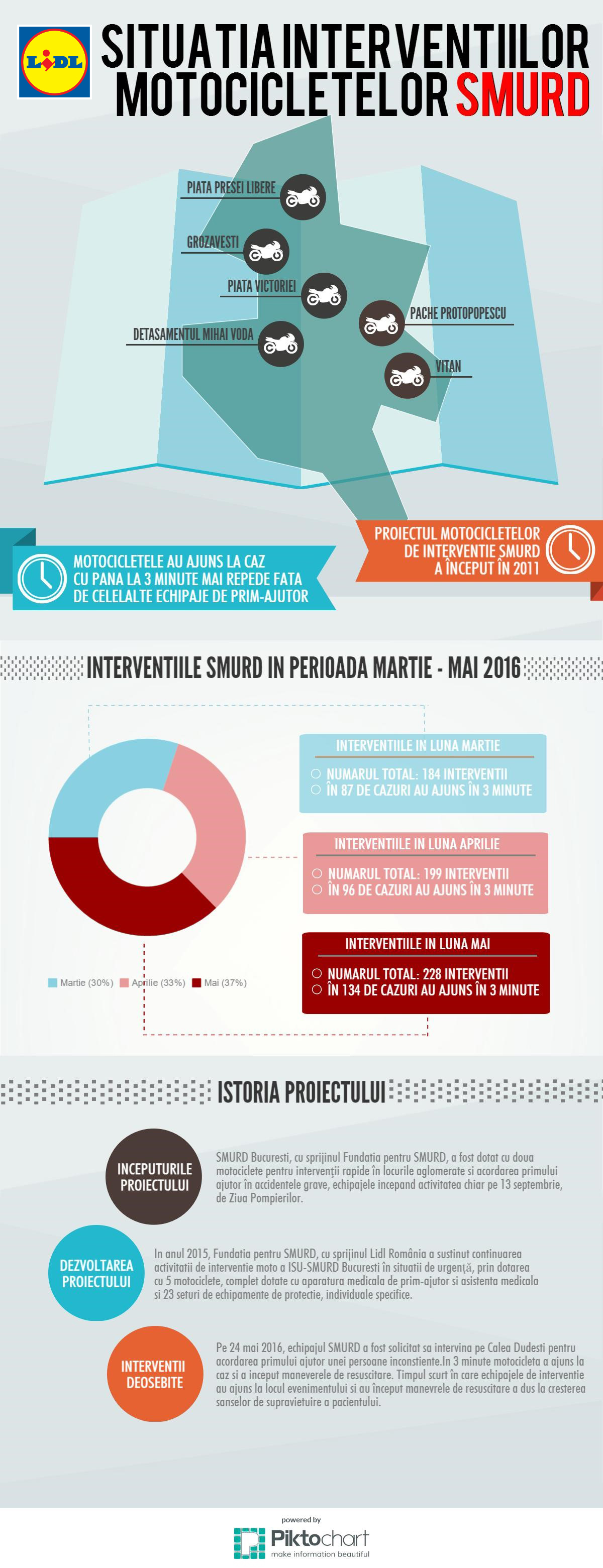 În doar 3 luni de la punerea în funcțiune, în intervalul martie-mai 2016, motocicletele de intervenție urbană SMURD din București au asistat deja 611 cazuri. Proiectul, susținut de către Lidl România printr-o donație de cinci motociclete specializate și complet echipate, își dovedește eficiența cu un timp de răspuns de până la 3 minute înaintea echipajelor de urgență, în peste 50% dintre apeluri.