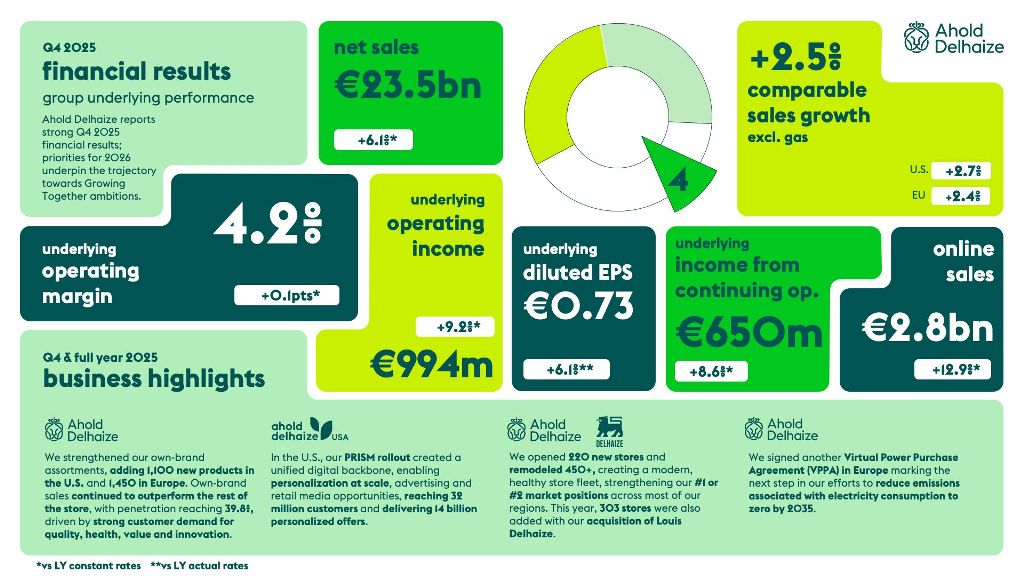 La nivel global, Ahold Delhaize a raportat în T4 2025 vânzări nete de aproximativ 23,5 miliarde de euro, în creștere cu peste 6% la curs constant, iar pentru întregul an a depășit 92 miliarde de euro. Marja operațională s-a menținut în jurul pragului de 4%, iar zona de e-commerce a continuat să avanseze cu două cifre. Dincolo de aceste cifre consolidate, integrarea Profi a avut un rol direct în dinamica pozitivă a diviziei europene.