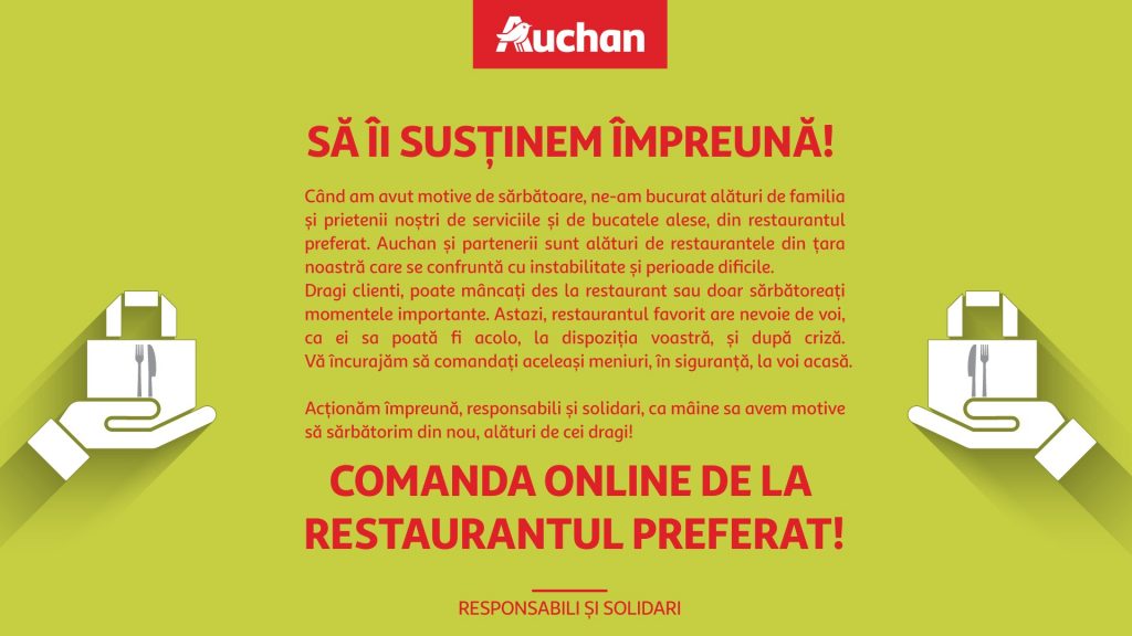 În semn de solidaritate pentru restaurantele care au fost nevoite să își sisteze activitatea în această perioadă, Auchan, împreună cu partenerii săi, centre comerciale, demarează o acțiune de susținere a acestora încurajându-și clienții să comande online de la restaurantele preferate din galeriile și centrele comerciale în care sunt prezente magazinele Auchan.