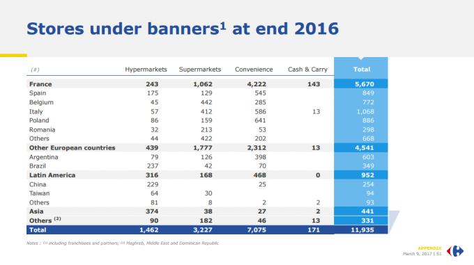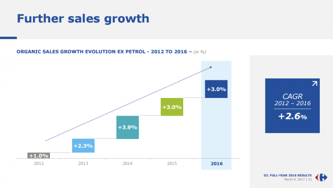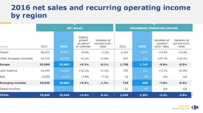 La nivel european, Carrefour a înregistrat vânzări de 55,9 miliarde de euro, în creștere cu 3% față de 2015, anul anterior.