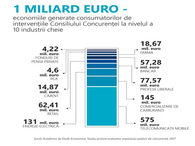 În cei 20 de ani de activitate, Consiliul Concurenței a generat peste 1 miliard de euro economii pentru cetățenii români, arată un studiu al Academiei de Studii Economice, care a evaluat impactul politicii de concurență din România asupra a 10 industrii-cheie din economia națională.