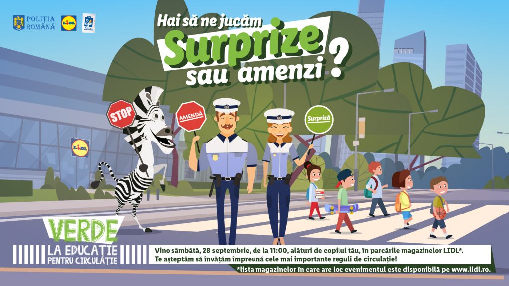 Pe 28 septembrie, fiecare copil cu vârsta între 4 și 10 ani va învăța cum să fie un pieton responsabil direct de la reprezentanții Poliției Române. Devenit deja tradiție, evenimentul național de educație rutieră „Verde la educație pentru circulație”, inițiat de Lidl și Poliția Română, își propune să îi învețe pe cei mici, dar și pe părinții lor, despre importanța cunoașterii și respectării regulilor de circulație. Proiectul are ca scop, totodată, formarea unui comportament responsabil în trafic al copiilor, pentru ca, pe termen lung, numărul de accidente în care sunt implicați, cu vină, cei mici, să se reducă. Astfel, an de an, copiii învață de la polițiști regulile de circulație necesare pentru a fi în siguranță ca pietoni în trafic.