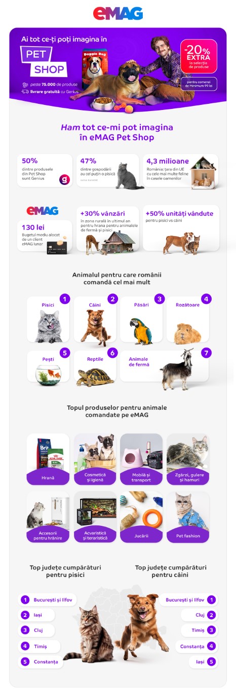 eMAG vine în întâmpinarea iubitorilor de animale și lansează Pet Shop, un shop-in-shop online cu o gamă variată de produse pentru toate animalele. Cu peste 8 milioane de pisici și câini care fac parte din viețile românilor, țara noastră se află în topul țărilor europene cu cele mai multe gospodării cu animale de companie, conform Eurostat.