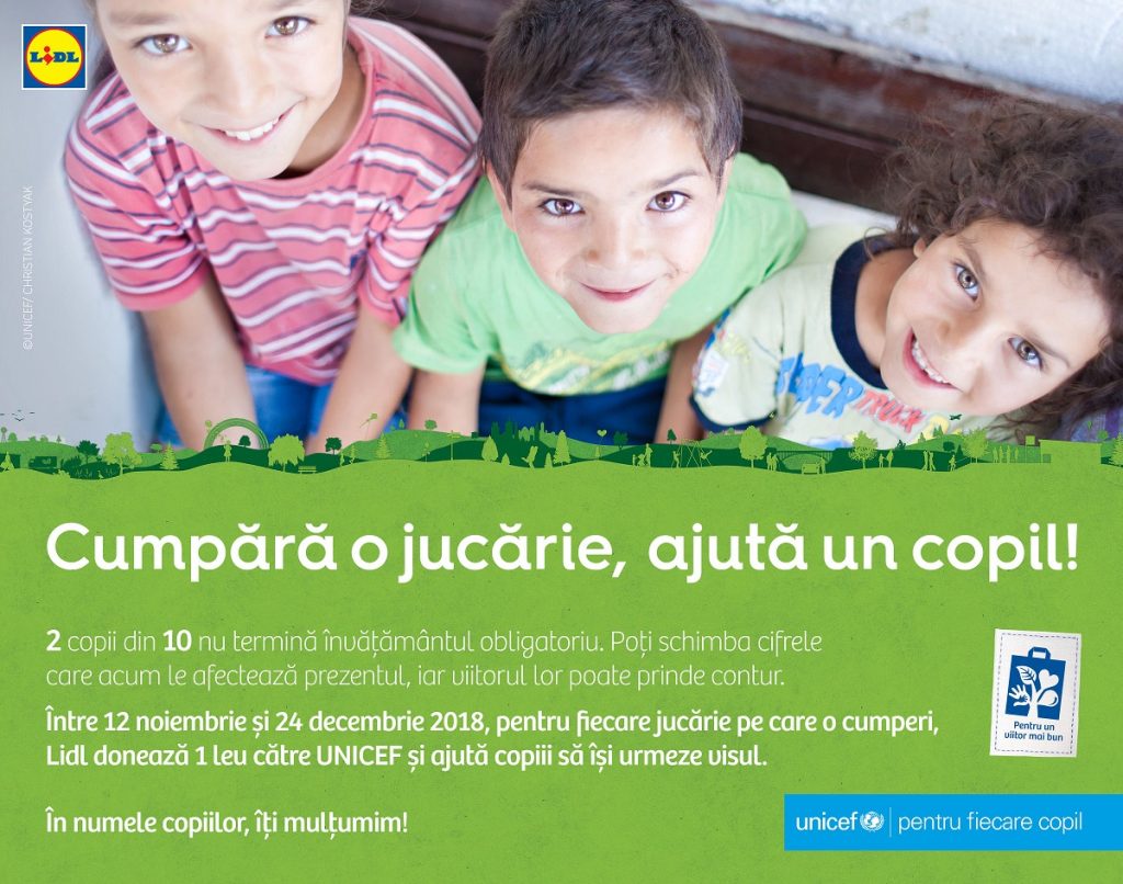 LidlCu ajutorul clienților săi, Lidl va sprijini UNICEF într-un demers comun prin care elevii din medii defavorizate vor fi susținuți în finalizarea învățământului obligatoriu. Astfel, în perioada 12 noiembrie – 24 decembrie, pentru fiecare jucărie achiziționată din magazinele sale, Lidl donează un leu către UNICEF.