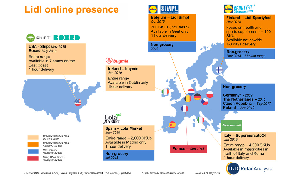 În ultimul an, retailerul german de tip discount Lidl și-a extins serviciile de comerț online, crescându-și prezența online de la 4 țări la 11 țări, în 5 dintre acestea având chiar vânzări online de produse alimentare, conform companiei IGD.