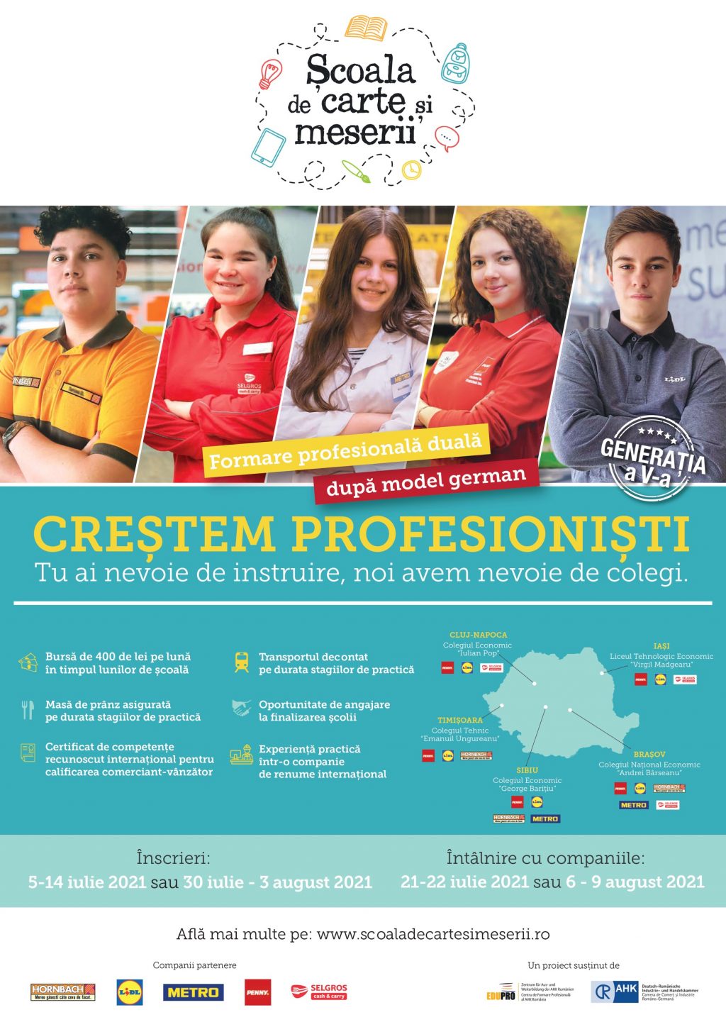 Pentru al cincilea an consecutiv, Lidl România continuă să investească în formarea viitorilor profesioniști din domeniul retailului, prin susținerea programului de învățământ dual Școala de Carte și Meserii. Anul acesta, proiectul se va desfășura în 5 licee din țară, iar înscrierile vor avea loc în perioadele 05 – 14 iulie și 30 iulie – 03 august 2021. Prin acest program, elevii care își doresc o carieră în retail au oportunitatea de a se pregăti pentru meseria de comerciant – vânzător, pe care o pot practica încă din timpul studiilor în magazinele Lidl din țară.