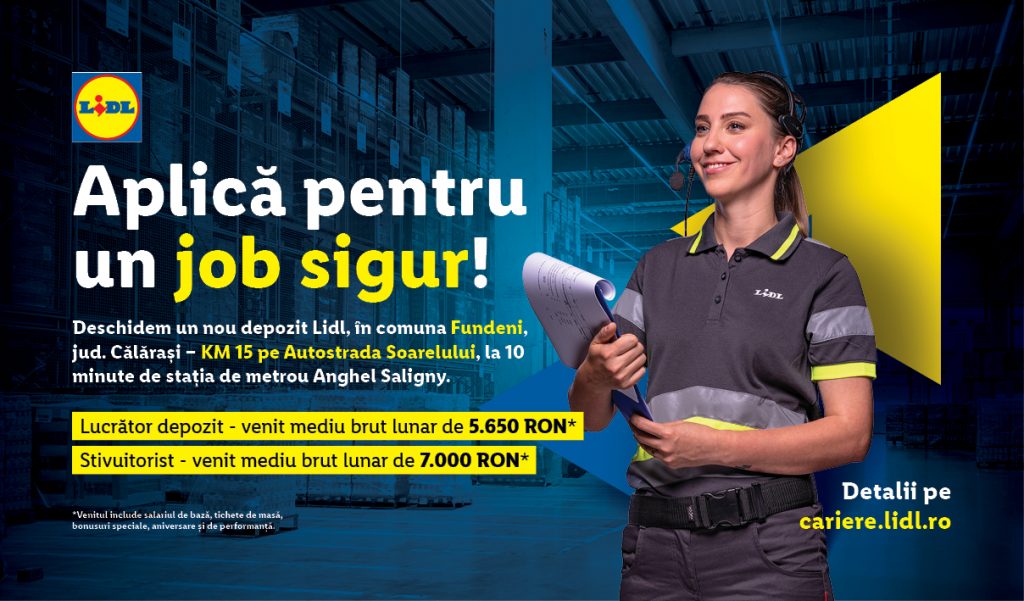 Candidații interesați să se alăture echipei Lidl în noul depozit regional din Fundeni, pot aplica pentru pozițiile de stivuitorist și lucrător depozit. Cele două poziții oferite de companie beneficiază de un venit mediu brut lunar de 7.000 lei, respectiv 5.650 lei, ce include salariul de bază, tichetele de masă, bonusurile speciale, aniversare și de performanță. În plus, retailer-ul oferă tuturor angajațiilor transport gratuit, asigurare medicală privată, acces la asigurare medicală pentru membrii familiei, asigurare în caz de accidente, precum și creșteri salariale anuale garantate.