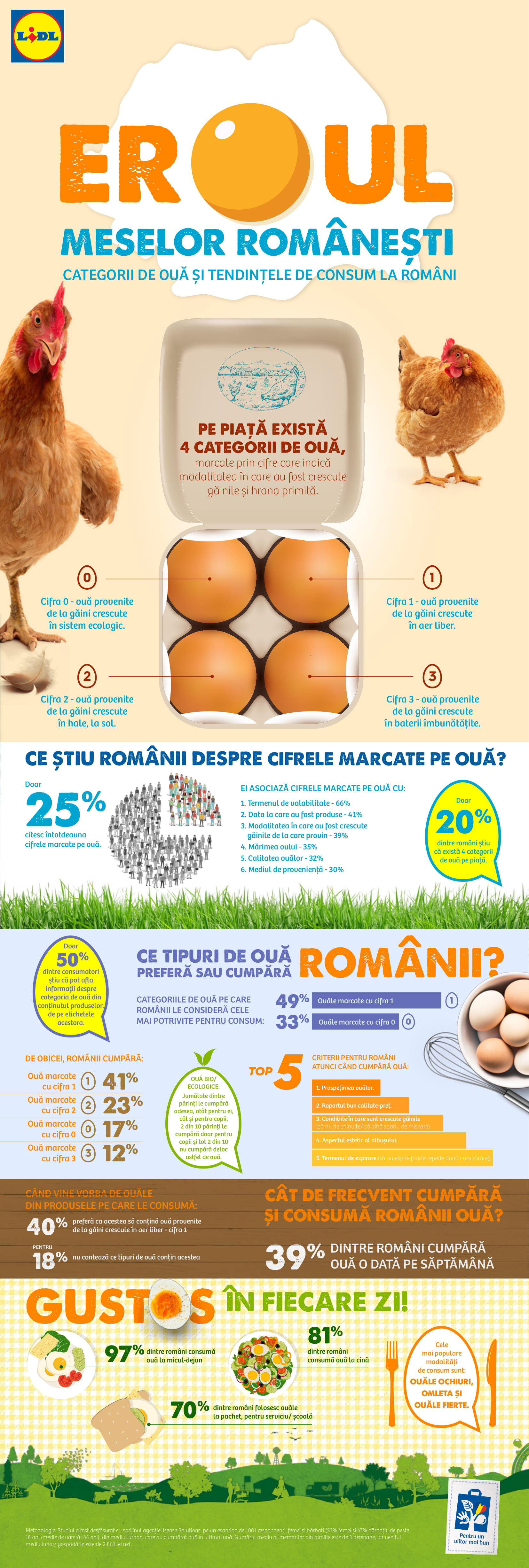 Metodologia Studiului Național al Consumului de Ouă: Studiul a fost desfășurat cu sprijinul agenției ISense Solutions, pe un eșantion de 1.001 de respondenți, femei și bărbați, de peste 18 ani, din mediul urban, care au achiziționat ouă cu minim o lună înainte de perioada de culegere a datelor. Marja de eroare +/-3,1, la un nivel de încredere de 95%.