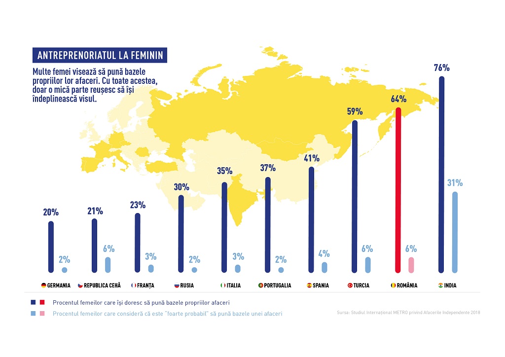 Conform studiului realizat de METRO în România, 64% dintre femei își doresc să-și deschidă propria afacere, dar numai 6% au încredere că pot pune în practică această idee. Problemele care alimentează această neîncredere sunt de ordin financiar. Un sfert (25%) dintre femeile care au participat la studiu și dețin în prezent o afacere au întâmpinat dificultăți în deschiderea afacerii. Ele au afirmat că strângerea fondurilor necesare și lipsa unui sprijin financiar au reprezentat cele mai dificile etape ale demarării afacerii lor.