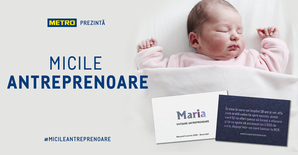Cu ocazia Zilei Internaţionale a Femeii, METRO Cash & Carry România prezintă MICILE ANTREPRENOARE, o campanie de încurajare a antreprenoriatului feminin, și oferă, în parteneriat cu BCR, un cec cadou în valoare de 1.500 euro, fetițelor născute pe 8 martie 2019, în București, pentru a le susține visul de a deveni antreprenoare la majorat.