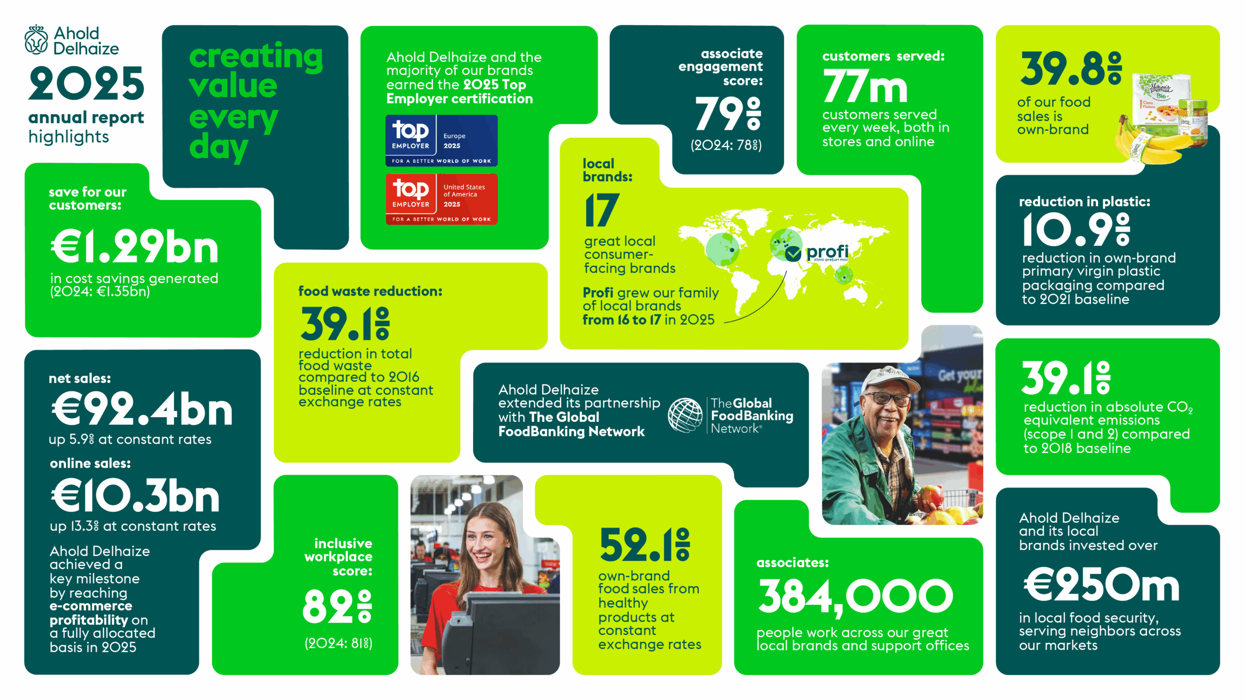 Ahold Delhaize este unul dintre cele mai mari grupuri de retail alimentar din lume și lider atât în supermarketuri, cât și în comerțul electronic. Familia sa de mărci locale excelente deservește 63 de milioane de clienți în fiecare săptămână, atât în magazine, cât și online, în Statele Unite, Europa și Indonezia.