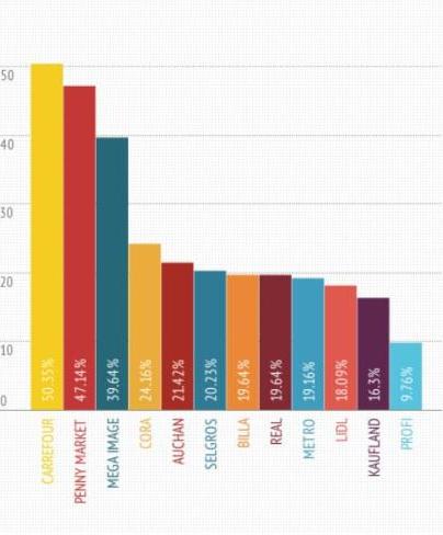 Procentul cel mai mare din scorul total fost obţinut de Carrefour (50.35%), urmat de Penny Market (47.14%), Mega Image (39.64%), Cora (24.16%), Auchan (21.42), Selgros (20.23%), Billa (19.64%), Real (19.64%), Metro (19.16%), Lidl (18.09%), Kaufland (16.3%) si Profi (9.76%).