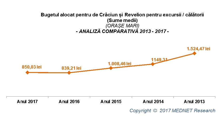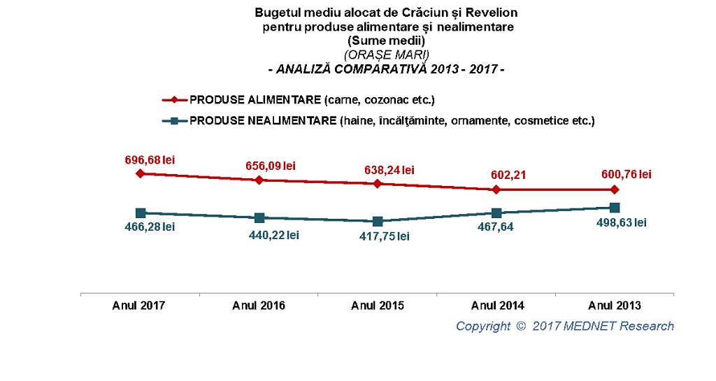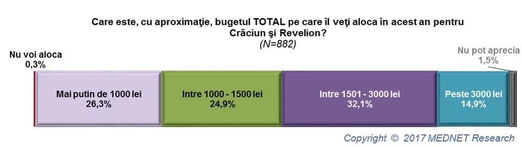 Conform unui studiu „Cumpărăturile de Sărbători”, realizat de MEDNET Marketing Research Center în mediul urban , bugetul total (Crăciun și Revelion) alocat pentru Sărbătorile din acest an este estimat la 1.717 lei.