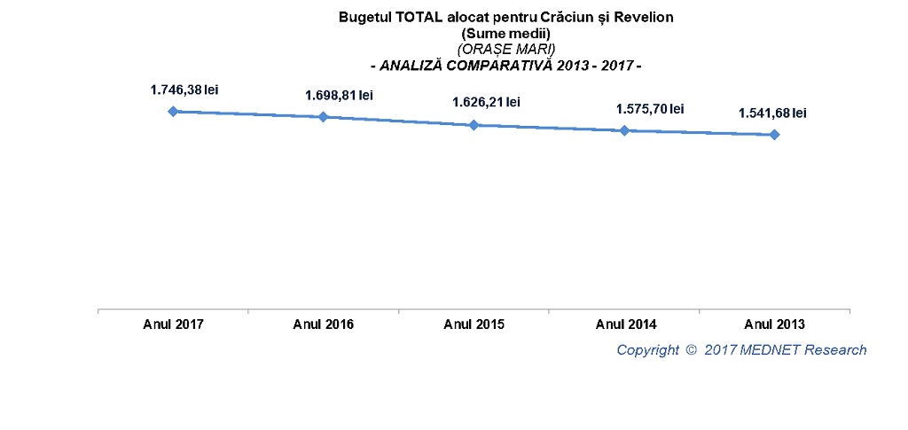 În orașele mari (+100.000 locuitori), suma medie alocată pentru Sărbătorile de Iarnă înregistrează un trend ascendent comparativ cu anii precedenți, bugetul mediu calculat pentru această categorie de orașe atingând o valoare de 1.746 lei.