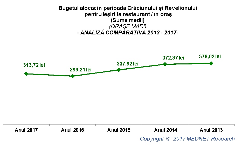 Nici pentru ieșirile la restaurant / în oraș, locuitorii orașelor mari (+100.000 locuitori) nu și-au mărit considerabil bugetul față de anul precedent (313,72 buget mediu în 2017 faţă de 299,21 lei buget mediu în 2016).În orașele mari, cei care vor pleca de sărbători în excursii / călătorii, sunt dispuși să aloce un buget comparabil cu cel din 2016 (850,03 lei în 2017 comparativ cu 839,21 lei în 2016).