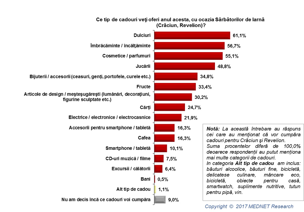 Și anul acesta procentul celor care intenționează să ofere cadouri de Sărbători (Crăciun și Revelion) depăşeşte 90%, cele mai căutate produse fiind dulciurile, articolele de îmbrăcăminte / încălțăminte sau cosmetice / parfumuri. Cei care se vor bucura de aceste cadouri vor fi, în special, membri ai familiei.