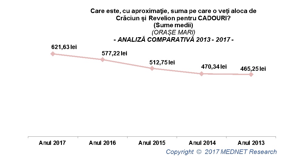 În ceea ce privește bugetul pentru cadouri, putem observa că suma alocată de respondenţii din orașele mari (+100.000 locuitori) este în creștere de la an la an (621,63 lei în 2017 faţă de 577,22 lei în 2016).