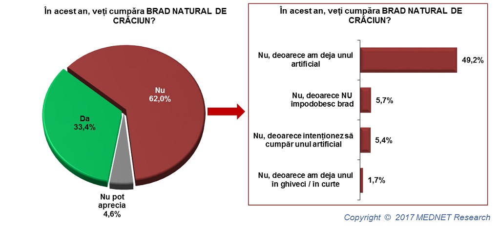 Anul acesta, puțin peste o treime dintre respondenții din mediul urban și-au exprimat intenția de a cumpăra un brad natural de Crăciun. Cei mai mulți dintre respondenți (49.2%) au deja unul artificial, în timp ce alţi 5.7% nu vor împodobi bradul.