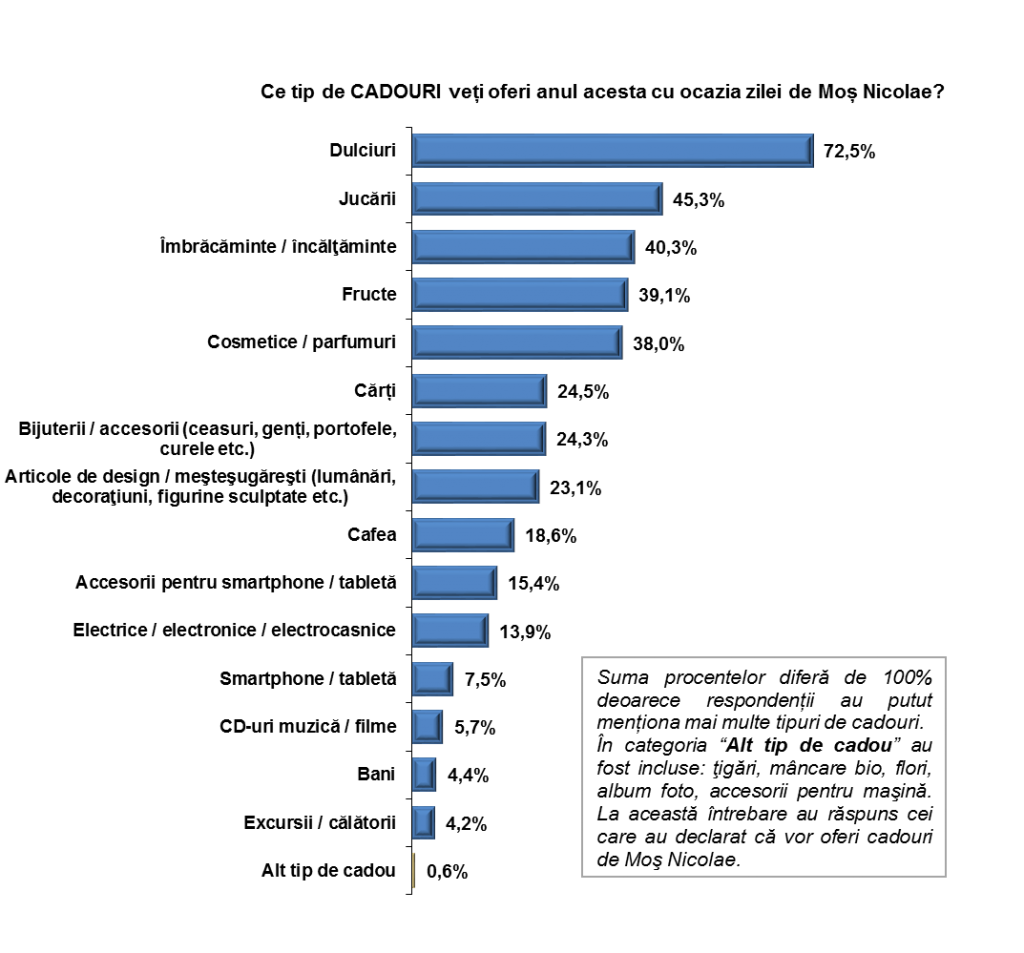 Ca tendinţă, lista de cadouri a Moşului seamănă cu cea de anul trecut, cele mai căutate fiind dulciurile (72,5%), jucăriile (45,3%) şi articolele de îmbrăcăminte/încălţăminte (40,3%). La aceasta, se mai adaugă şi fructele, cosmeticele/parfumurile sau cărţile. De asemenea, au fost menţionate şi cadouri precum bijuterii, electrice/electronice/electrocasnice, smartphone/tabletă sau excursii/călătorii. Trebuie precizat faptul că, acolo unde moșul nu are inspirație, aduce și bani (4,4%).