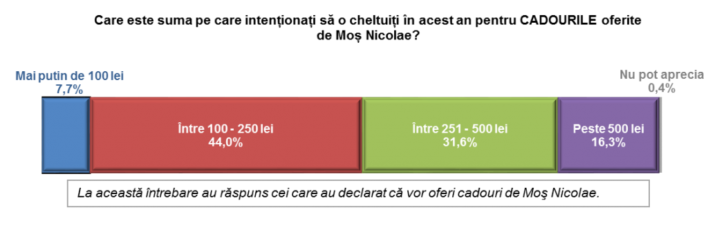 Mai mult decât atât, suma medie de bani alocată pentru cadourile generate de această sărbătoare este de 340 lei, în uşoară creştere comparativ cu cea de anul trecut (318 lei). Pe de altă parte, s-ar putea spune că, deşi în oraşele mici intenţia de cumpărare este mai mare, suma medie “rezervată” cadourilor este mai mică decât în oraşele cu peste 100.000 de locuitori.