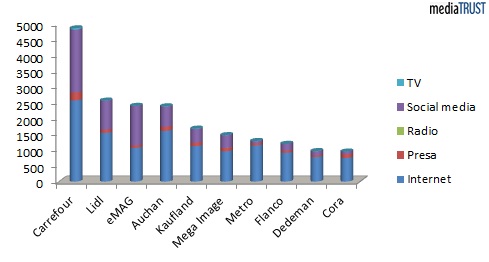Carrefour este retailerul care a înregistrat cele mai multe apariţii media‚ în intervalul 1 ianuarie – 31 martie 2014, 4.860 de materiale, cele mai multe dintre ele fiind în mediul online. Locul doi, în topul general al apariţiilor media, este ocupat de Lidl cu 2.568 de menţiuni înregistrate. eMag a înregistrat 2.401 de menţiuni şi ocupă locul trei în top. Pe locul patru se află Auchan cu 2.388 de menţiuni, urmat de Kaufland cu 1.680 de menţiuni. Mega Image este în top cu 1.474 de menţiuni, iar Metro a înregistrat în primele trei luni 1.288 de materiale. Flanco este pe locul opt cu 1.199 menţiuni, urmat de Dedeman cu 969 menţiuni şi Cora cu 954 menţiuni.