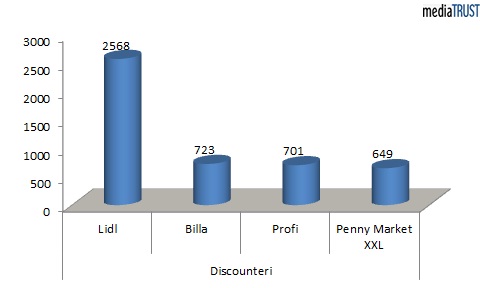 La categoria discounteri, Lidl este brandul cel mai activ, din punct de vedere al numărului de materiale înregistrate, 2.568. Prezent pe piaţa din România din anul 1999, Billa ocupă locul doi în top cu 723 de materiale înregistrate în primele trei luni ala anului 2014. Profi este pe locul trei la categoria discounteri cu 701 materiale înregistrate, urmat de Penny Market XXL cu 649 menţiuni.