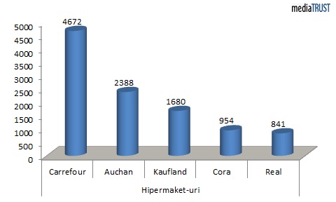 Carrefour conduce clasamentul la categoria hypermarket-uri cu 4.672 de materiale înregistrate pe toate mediile de difuzare, în intervalul 1 ianuarie-31 martie. Poziţia a doua este ocupată de Auchan cu 2.388 de materiale, urmat de Kaufland cu 1.680 de menţiuni. Cora a înregistrat în intervalul analizat 954 de menţiuni, iar Real 841 de menţiuni.