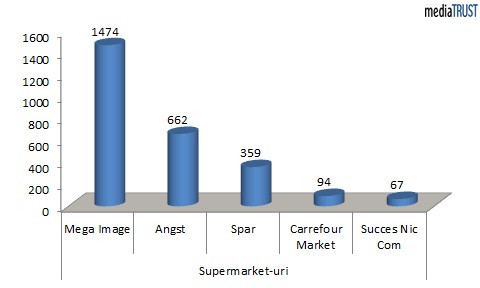 La categoria supermarket-uri, Mega Image conduce clasamentul cu 1.474 de menţiuni, urmat de Angst cu 662 menţiuni. Grupul olandez Spar, intrat pe piaţa românească din 2005, este pe locul trei în top cu 359 de menţiuni. Pe locul patru de află Carrefour Market cu 94 de materiale, urmat, la mica distanţă, de Succes Nic Com cu 67 de menţiuni.