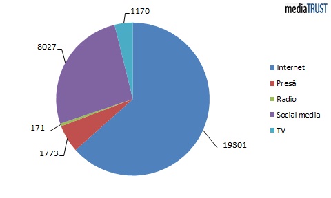 În ceea ce priveşte distribuţia materialelor pe tipuri de media, din cele 30.442 de menţiuni înregistrate în perioada 1 ianuarie – 31 martie 2014, aproximativ 80% au fost în mediul online. Retailerii de pe piaţa românească au înregistrat cele mai multe apariţii în mediul online (27.328 mentiuni), urmat de presa scrisă (1.773 menţiuni), televiziuni (1.170 mentiuni) şi radiouri (170 mentiuni).