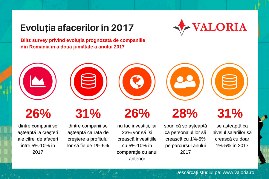 Conform studiului „Evoluția afacerilor în 2017” lansat azi de Valoria, în a doua jumătate a anului companiile au operat ajustări semnificative la valorile previzionate anterior pentru cifra de afaceri, profitul, numărul de angajați, nivelul salariilor și al investițiilor din acest an.