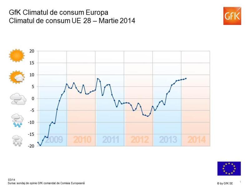 Optimismul care a pus acum stăpânire pe mulţi consumatori europeni este ca urmare pe deplin justificat. În aproape toate ţările reprezentate aici, indicatorii legați de aşteptările privind starea economiei şi veniturile, precum şi dorinţa de cumpărare, prezintă tendinţe ascendente. În multe ţări, aceşti indicatori au atins niveluri care nu au fost înregistrate de ani de zile. Indicele climatului de consum pentru UE (28 de ţări) este de asemenea în creştere. În martie, acesta se afla la 8,4 puncte, o creştere de 0,8 puncte în primul trimestru al acestui an şi cea mai ridicată valoare înregistrată din aprilie 2008. Exact cu un an în urmă, el se situa la -3,3 puncte.