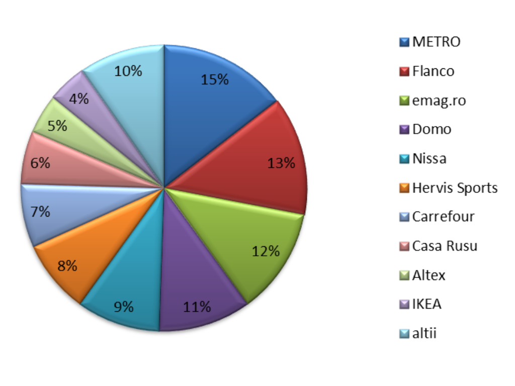Pentru vizibilitatea în publicitate raportul a luat în calcul rezultatele monitorizării a peste 37.325 de reclame difuzate în intervalul de timp 1 noiembrie – 2 decembrie 2013, la 20 de posturi de televiziune, 12 posturi de radio şi 200 de publicaţii centrale, la categoria Comerţ.