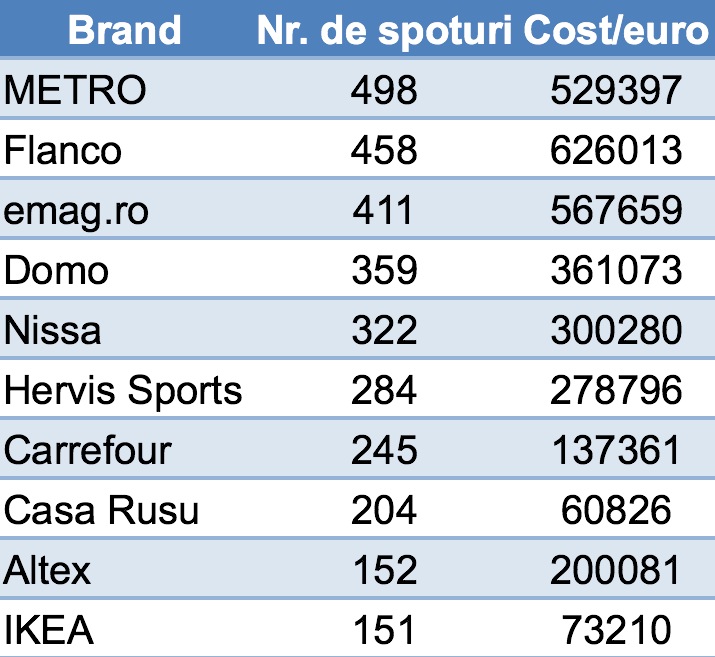 Astfel, Metro Cash & Carry este cel mai vizibil retailer în topul mediaTRUST, cu 498 de spoturi publicitare difuzate pentru Black Friday, urmat de Flanco cu 458 de reclame.