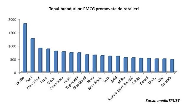 Jacobs, Boni și Mărgăritar sunt brandurile FMCG cele mai promovate de către retaileri în primul trimestru al anului 2013. Jacobs este cel mai promovat brand în publicitate cu 1.804 de reclame, urmat de Boni (1.250 reclame) și Mărgăritar (891 reclame). Pintre brandurile FMCG cu cea mai bună promovare în reclamele retailerilor se mai numără: Fabio (861), Clever (780), Casablanca (761), Pepsi (731), Top Apetit (720), Blue Brand (646), etc.