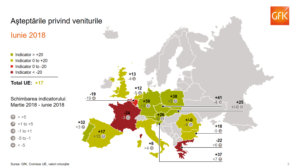 În ciuda unei ușoare scăderi a înclinației către cumpărare, sentimentul consumatorilor în Europa măsurat de GfK a crescut la 23,2 puncte în al doilea trimestru din 2018, întrucât aici se ia în considerare și calculul înclinației către economisire, aflată tot în scădere.